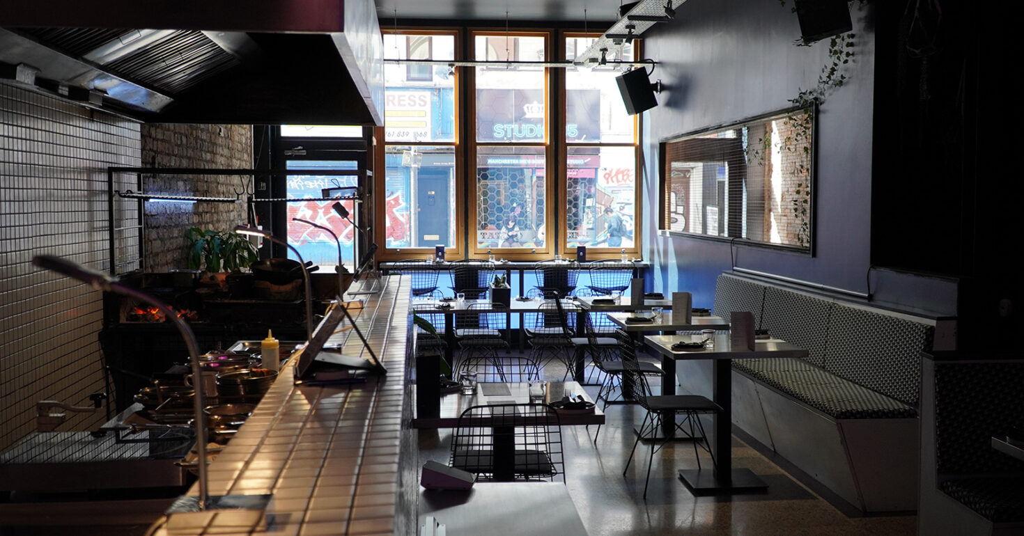 District makes perfect sense, then. Arriving through the discreet Oldham Street entrance, attention is instantly drawn to the neon metropolitan scene rendered on the back wall, lights reflecting through the dining room by way of stainless steel fittings, open kitchen with wok and flame firing up centre stage, and bare brickwork to the right, where a pair of turntables and mixer are also set up. This progressive Thai eatery takes loose inspiration from a ‘future Bangkok’, an objective vision here used to create a concept that definitely feels tangible, and complete.