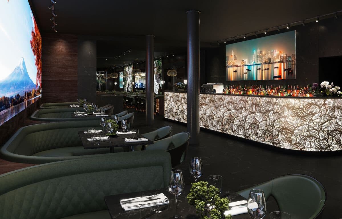 MUSU’s private dining room accommodates up to 14 guests. Separated by a glazed telescopic wall, the latter can be frosted at the touch of a button to deliver total privacy where necessary. It will also feature three incredible video walls displaying fluid structures, perfect visuals, presentations and ambient backgrounds.