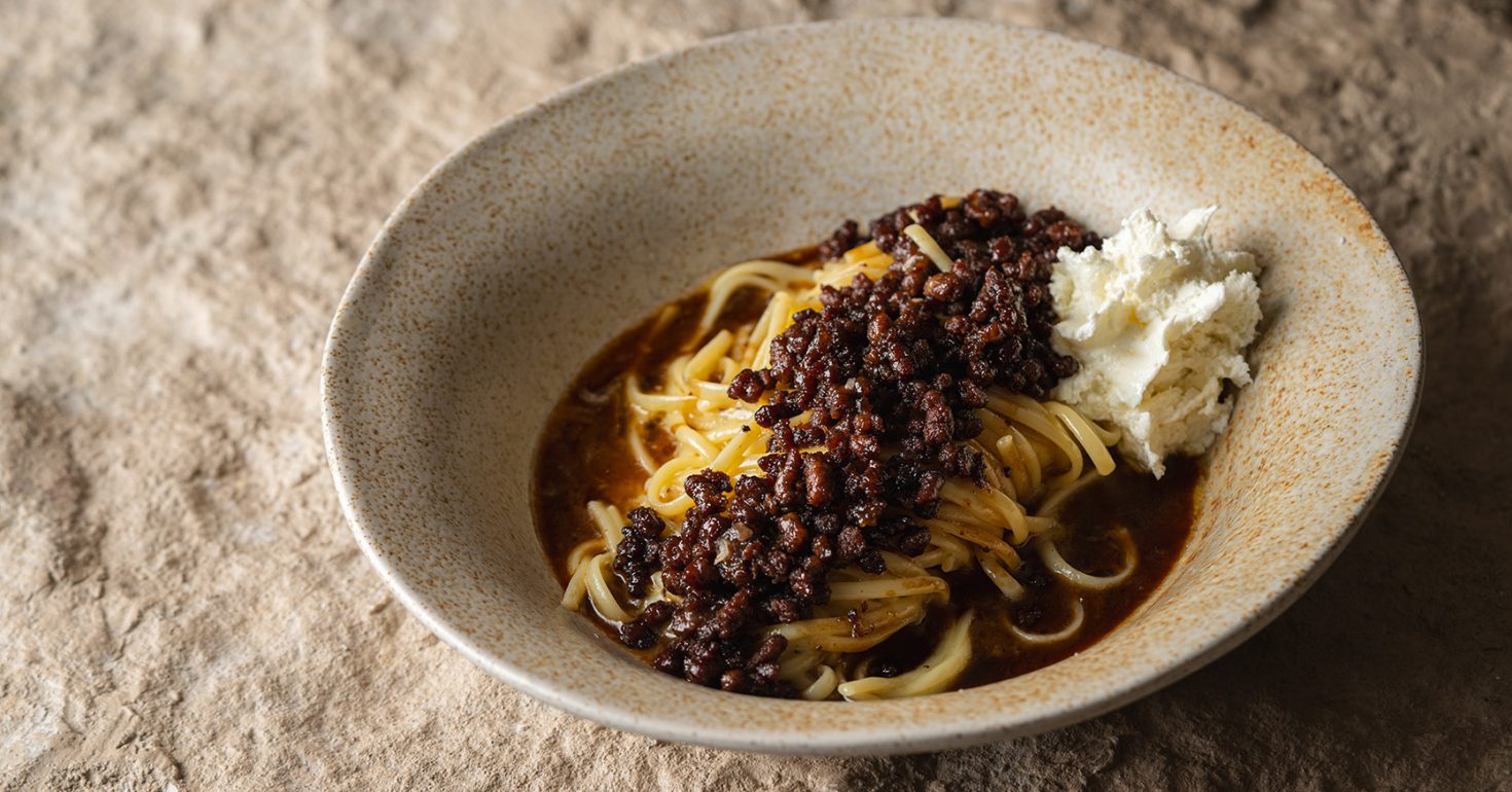 A dish of rich, minced wagyu beef – a wagyu ragu, if you will – is mixed at the table, folded into a bowl of warm linguine with a light, almost mousse-like ‘espuma’ made with a traditional Greek manouri cheese, made from sheep’s cheese, but given an upscale twist.