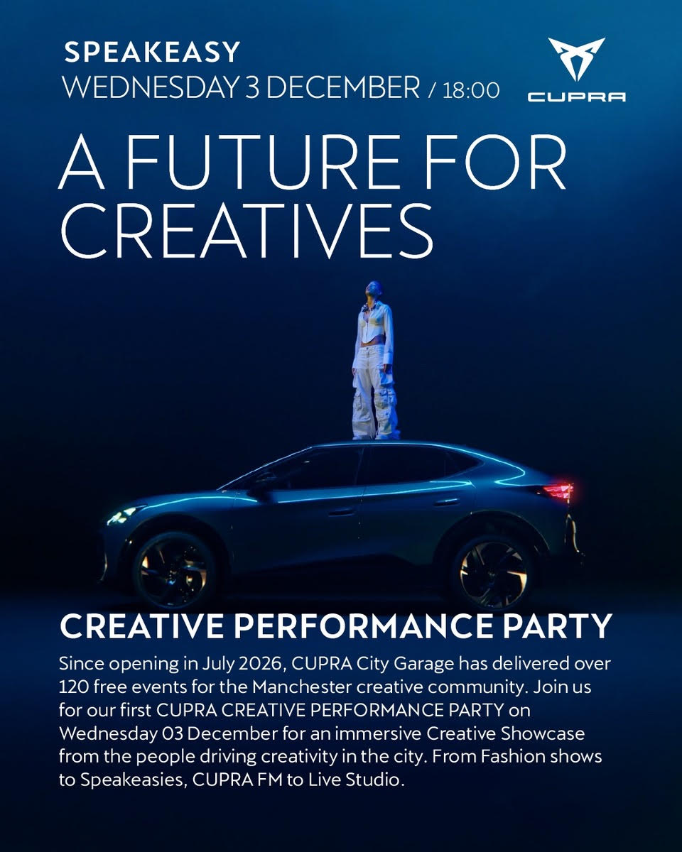 Since opening in July 2025, CUPRA City Garage has delivered over 120 free events for the Manchester creative community. Join them for their first CUPRA Creative Performance Party on Wednesday 3 December for a creative showcase from influential people across the city. From fashion shows to Speakeasies, CUPRA FM to Live Studio, come and meet the team, engage in social Q&As and watch exclusive performances from the future of creatives. This is also your invitation to be a part of the program in 2026.