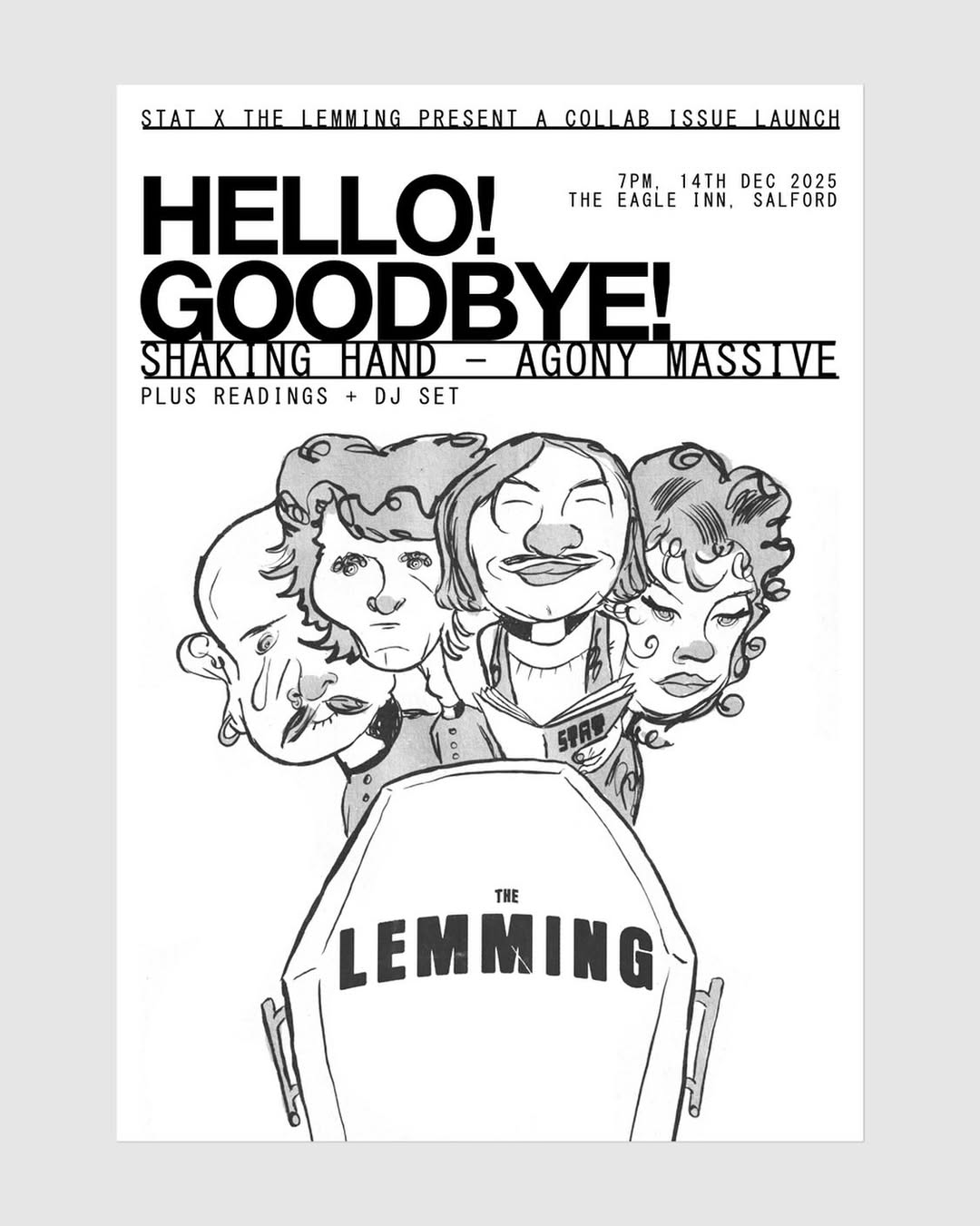 Three issues and a funeral. Celebrate The Lemming’s final issue, and a bumper double issue of STAT Magazine with a night of live music at The Eagle Inn pub in Salford. Performances by Agony Massive and Shaking Hand. What’s not to like? Consider it a Christmas do from your favourite anti-profit mags.