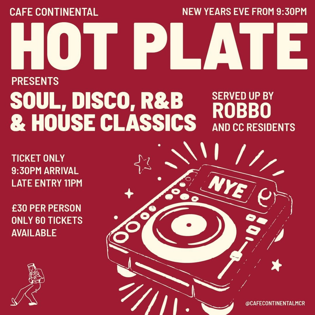 Stalybridge’s Cafe Continental are celebrating NYE with the return of their Hot Plate night, served up by Robbo and the Cafe Continental resident DJs. Expect soul, disco, house and RnB classics, with cavorting late into the night. It’s £30 a head, tickets are limited, and to book you must email abbey@thecafecontinental.com.