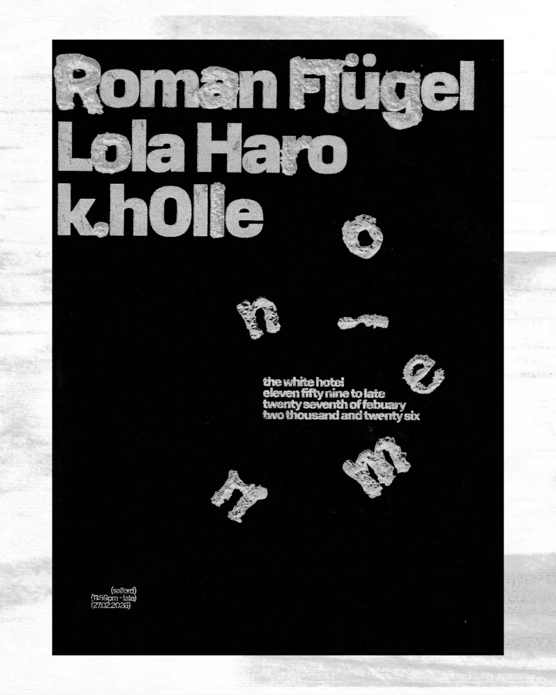 Active since the early 1990s, iconic German producer and DJ-par-excellence Roman Flügel is known as a chameleon, adopting many styles from ambient/IDM to house, techno and electro. He lands at Salford’s ever-innovative White Hotel for a party way into the early hours. He’s joined by Belgian artist Lola Haro as well as local Crop Radio resident k.h0lle.