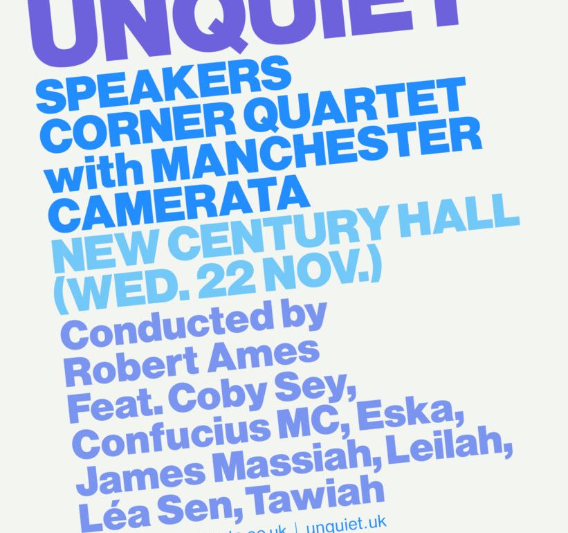 Working with a rotating cast of contemporary artists, UNQUIET bring a fresh set of collaborations and world premieres to Manchester and beyond. Taking place on Wednesday 22 November at New Century, this edition will see the world’s first Speakers Corner Quartet orchestral show.