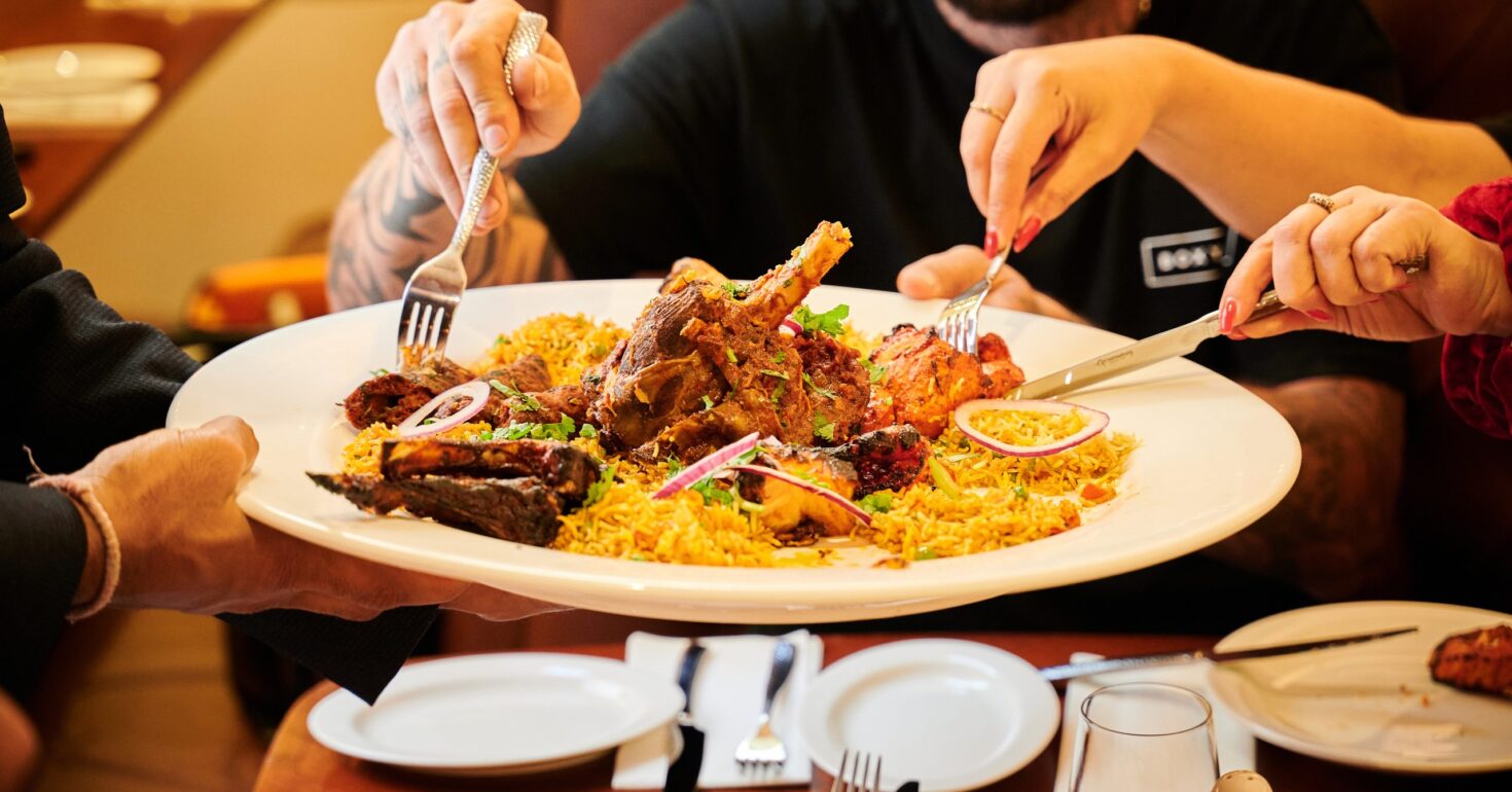 First up, though, the location. Found in the lower ground floor of a historic red brick apartment building on Princess Street, customers climb down the steps into a sophisticated, minimalist dining room with clean lines framing ornately patterned carpet, walls and ceiling. Open late into the night, there’s a fully licensed videsi bar, which plies an excellent trade in speciality cocktails. Onto the food, and you’ll find an easy to decipher menu, mains separated into different meats, fish and veg options, with plenty of classics available — Jaipuri and Bombay Aloo, Lamb Rogan, or Chicken Korma.