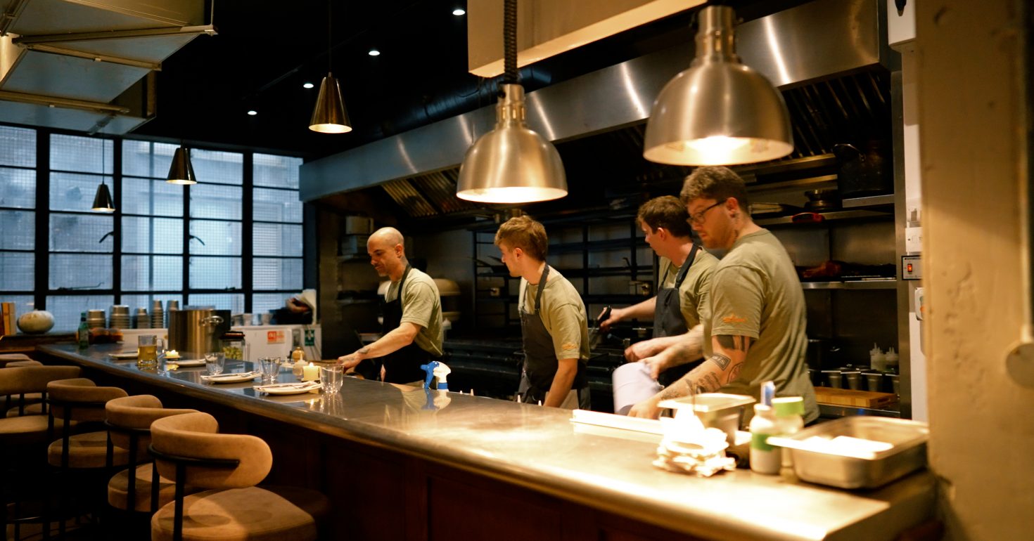 The restaurant has two distinct personalities: up front is the cocktail bar, all slick monochrome lines and vintage touches; down the corridor, things soften in the main dining room where earthy textures meet candlelit warmth. At the centre of it all is the open kitchen, dominated by a Gozney oven, a Big Green Egg, and chefs moving charcoal as often as they plate dishes. The counter dining seats at the pass offer a close-up view of the fire in action – and it’s not just for show. This is a kitchen powered entirely by flame, and that decision infuses every plate with purpose and personality.