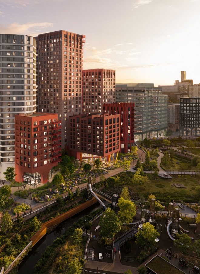The development also boasts a range of communal and social spaces, including a large private dining room, gaming rooms, co-working spaces and a cinema room, as well as activities from live music to puppy yoga (pets are welcome in the development too, at no extra cost) organised by a resident’s app.